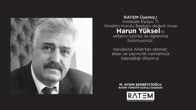 RATEM Üyemiz, Kırıkkale Radyo 71 Yönetim Kurulu Başkanı değerli insan Harun Yüksel'in vefatını üzüntü ile öğrenmiş bulunuyoruz. Kendisine Allah'tan rahmet, ailesi ve yayıncılık camiamıza başsağlığı diliyoruz.